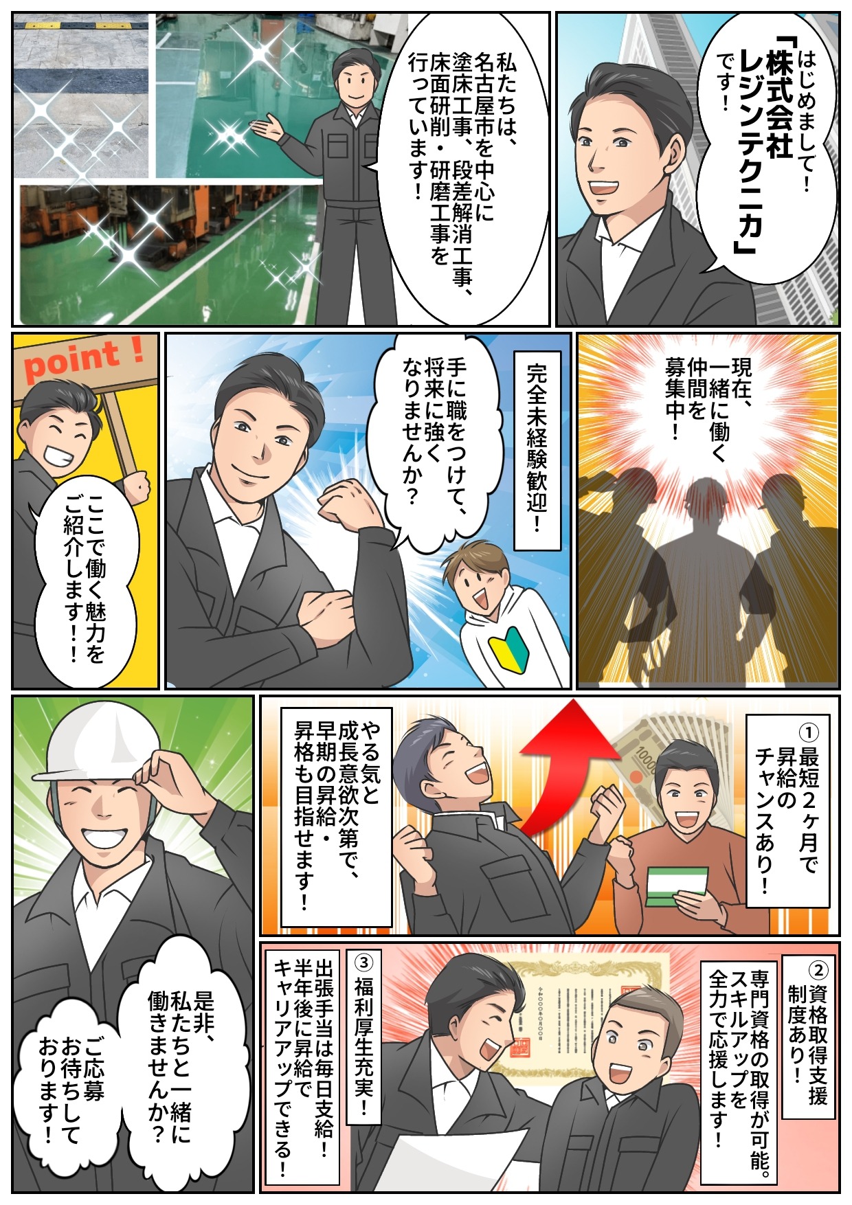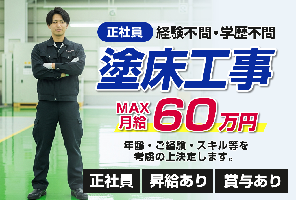 当社が手がけているのは床を塗装する塗床や防水施工。大手自動車関連メーカーや食品加工を手掛ける工場、飲食店、自動車ディーラー等の店舗など様々な床面のコーティングを手掛けています。突発的な案件が少ないため残業も少なく、また、長く働く環境づくりの一環として働きやすい作業服の支給や手当の底上げも行うなど、働きやすい環境整備を行っています。週2日のペースで休暇もしっかり!未経験から手に職を付けませんか?